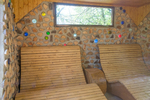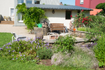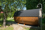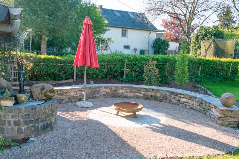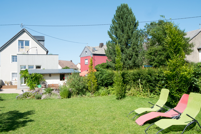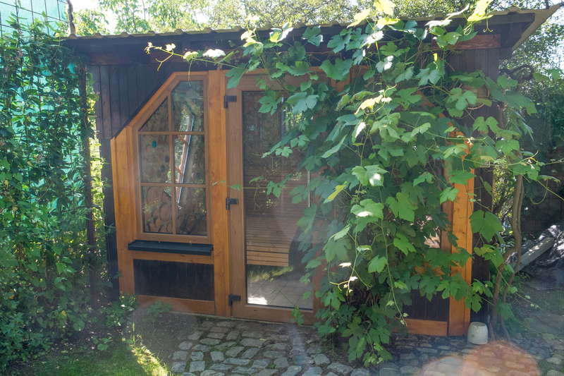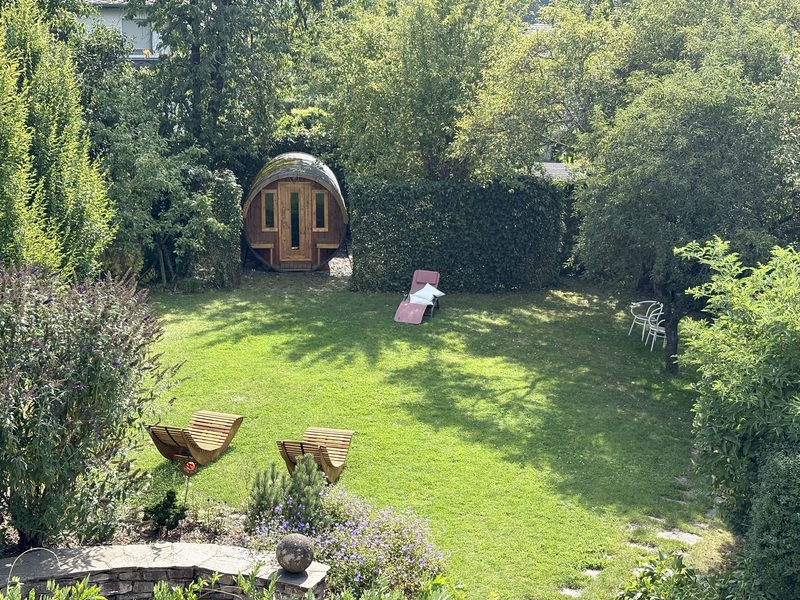 - Garten mit Fasssauna, Ruheraum und Ruheliegen